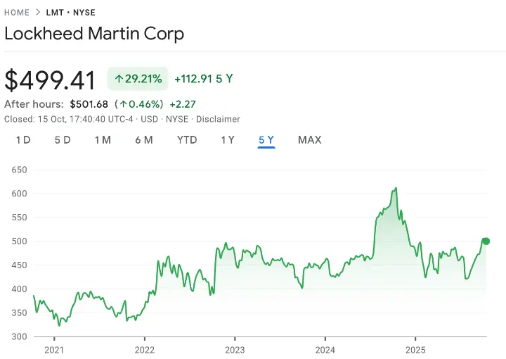 If you are a giant nerd, you can actually measure historic volatility by doing statistics on the chart of a stock. But to save you some time, I'll just show you two very revealing stock charts. Ignoring the ethics of selling guns for a minute, let's just analyse the stock performance of LMT: