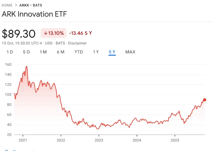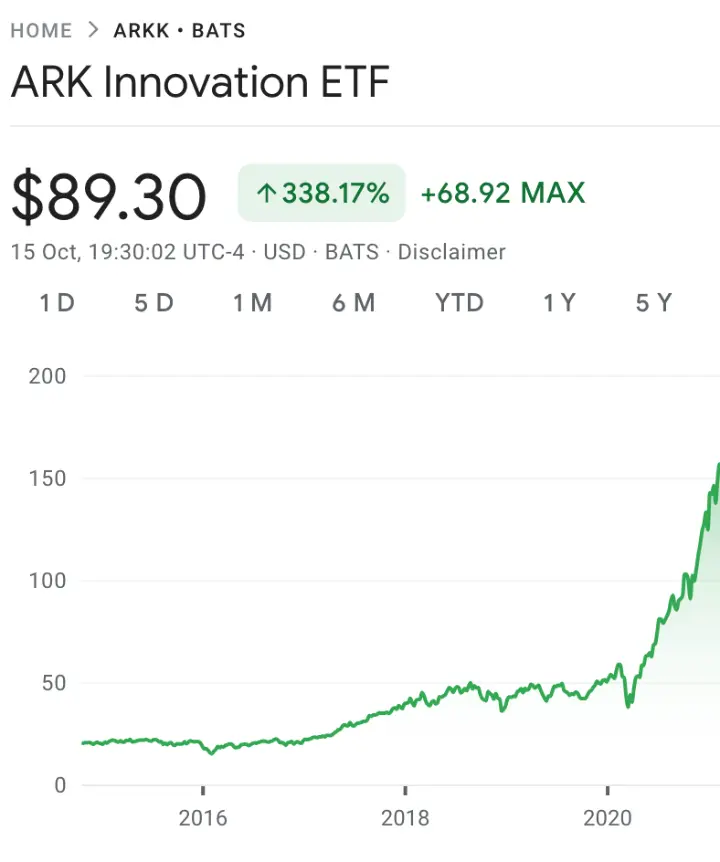 It looks pretty tasty, and you think to yourself, "I'd like a piece of that action!" The more observant of you (well done!) will notice that in fact this is the SAME ARK innovation fund, that we also know will eventually drop to a low of $31 dollars not long after this chart has been chopped off.